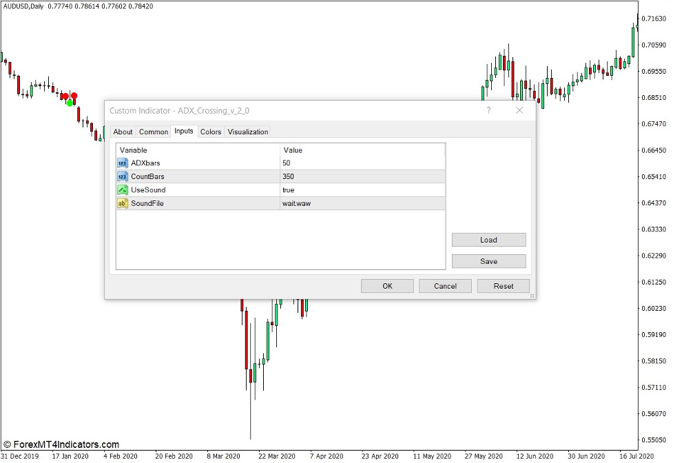 ADX Crossing Indicator มีตัวเลือกอินพุตหลายตัวภายในการตั้งค่าตัวบ่งชี้